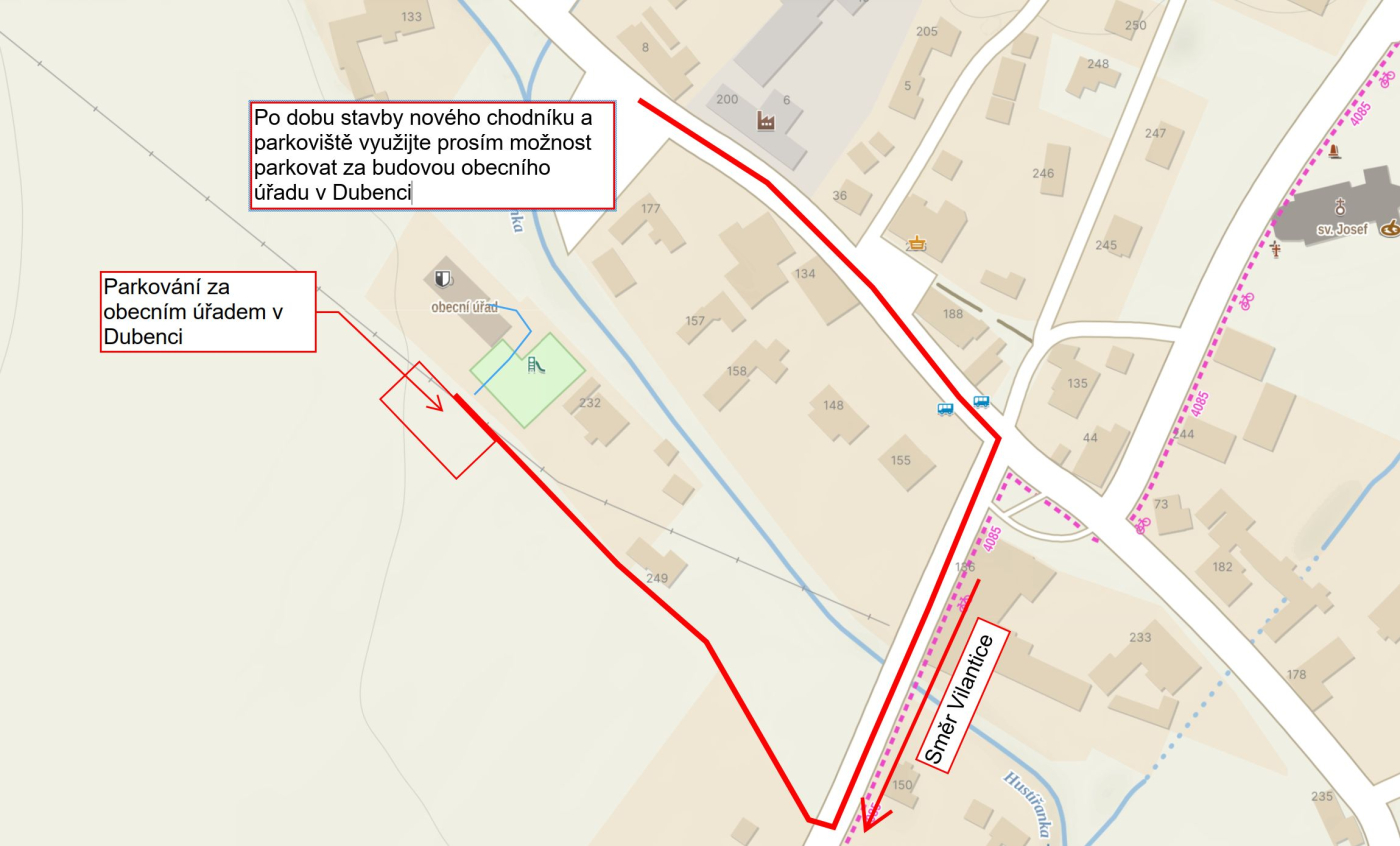 Z důvodu stavby Revitalizace veřejného prostranství před OU v Dubenci je dočasně omezeno, jak parkování, tak i vstup do budovy obecního úřadu.